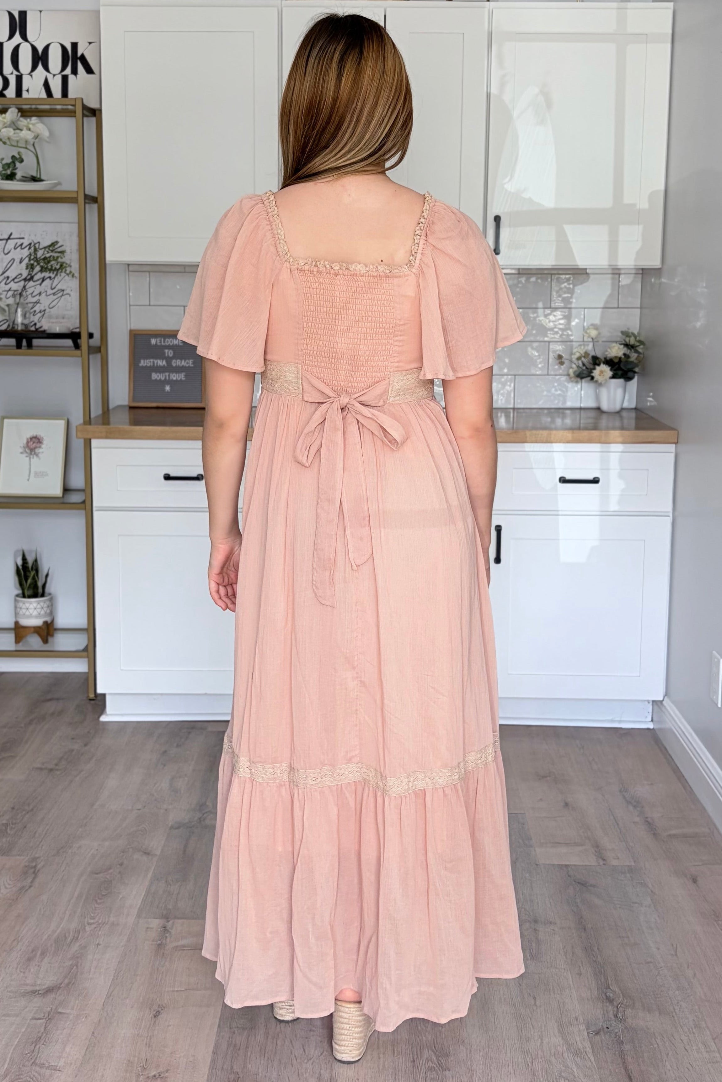 Designed with elastic shoulders and soft flutter sleeves, it features a smocked back bodice for comfort and shape, while a belted self-tie sash defines the waist. A hidden side zipper creates a clean fit, and side pockets add everyday ease.