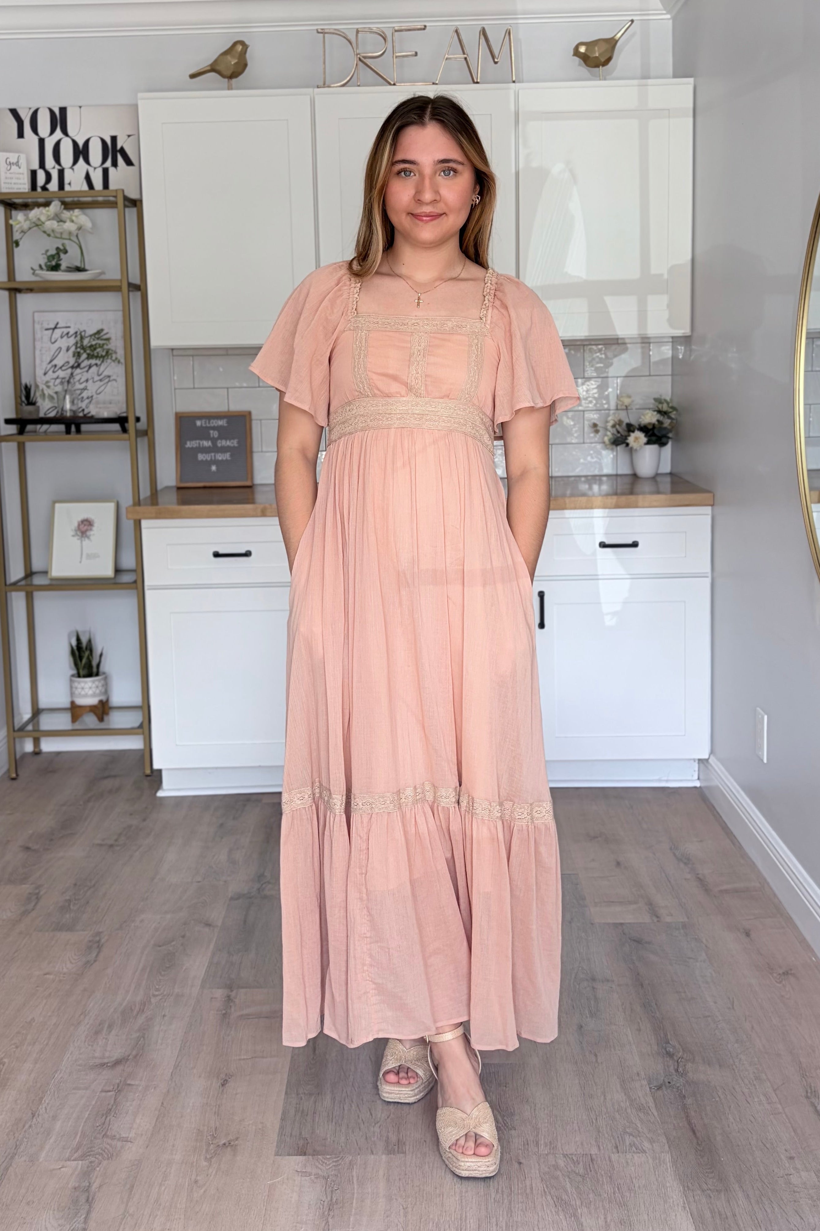 The Elise Lace Gauze Maxi is crafted from lightweight cotton gauze with delicate lace inset detailing throughout.