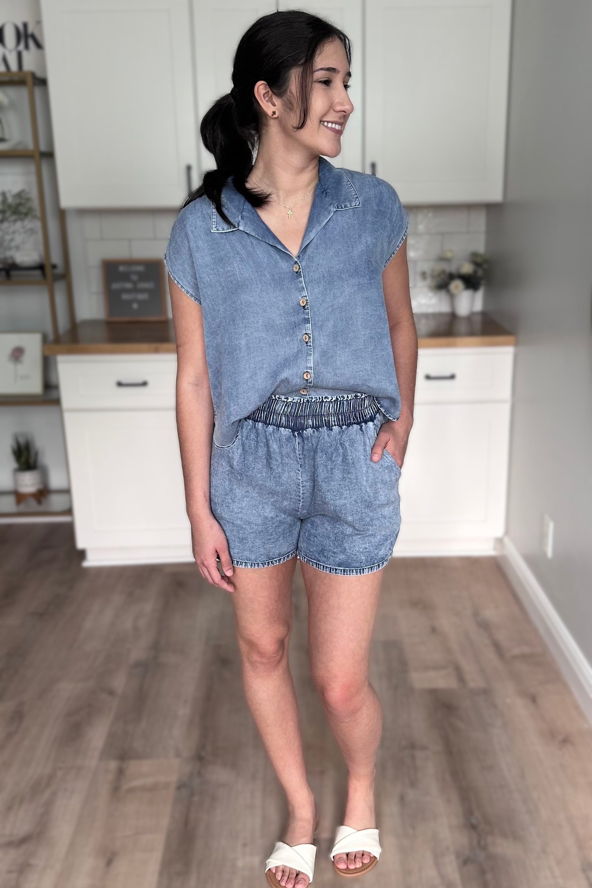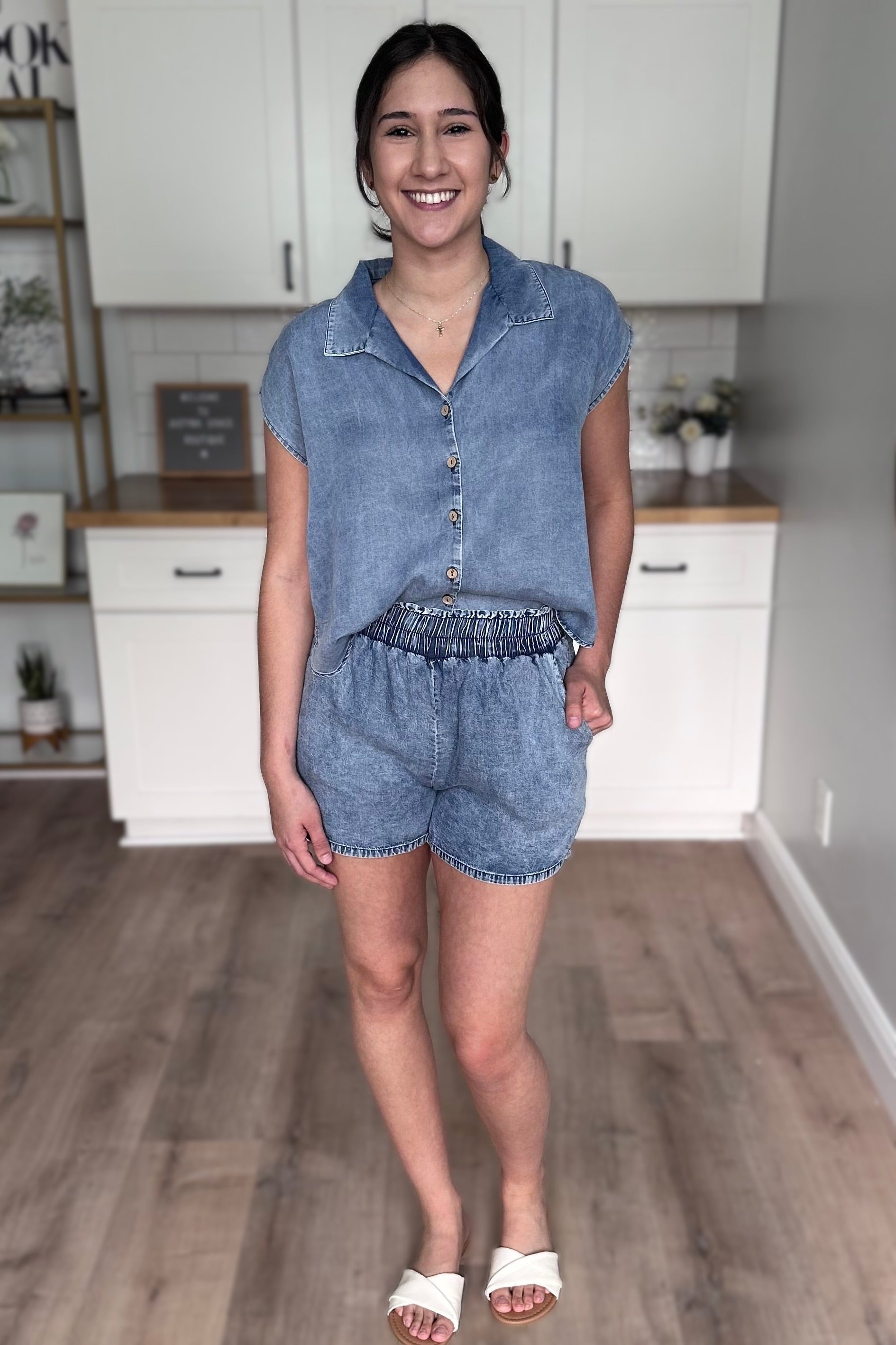 Soft, lightweight, and breathable, these mineral wash Tencel shorts are crafted from 100% Tencel with a smooth, fluid drape. Designed for warm-weather comfort, they feature an elastic waistband with subtle ruffle detail and functional side pockets for an easy, everyday pull-on fit.