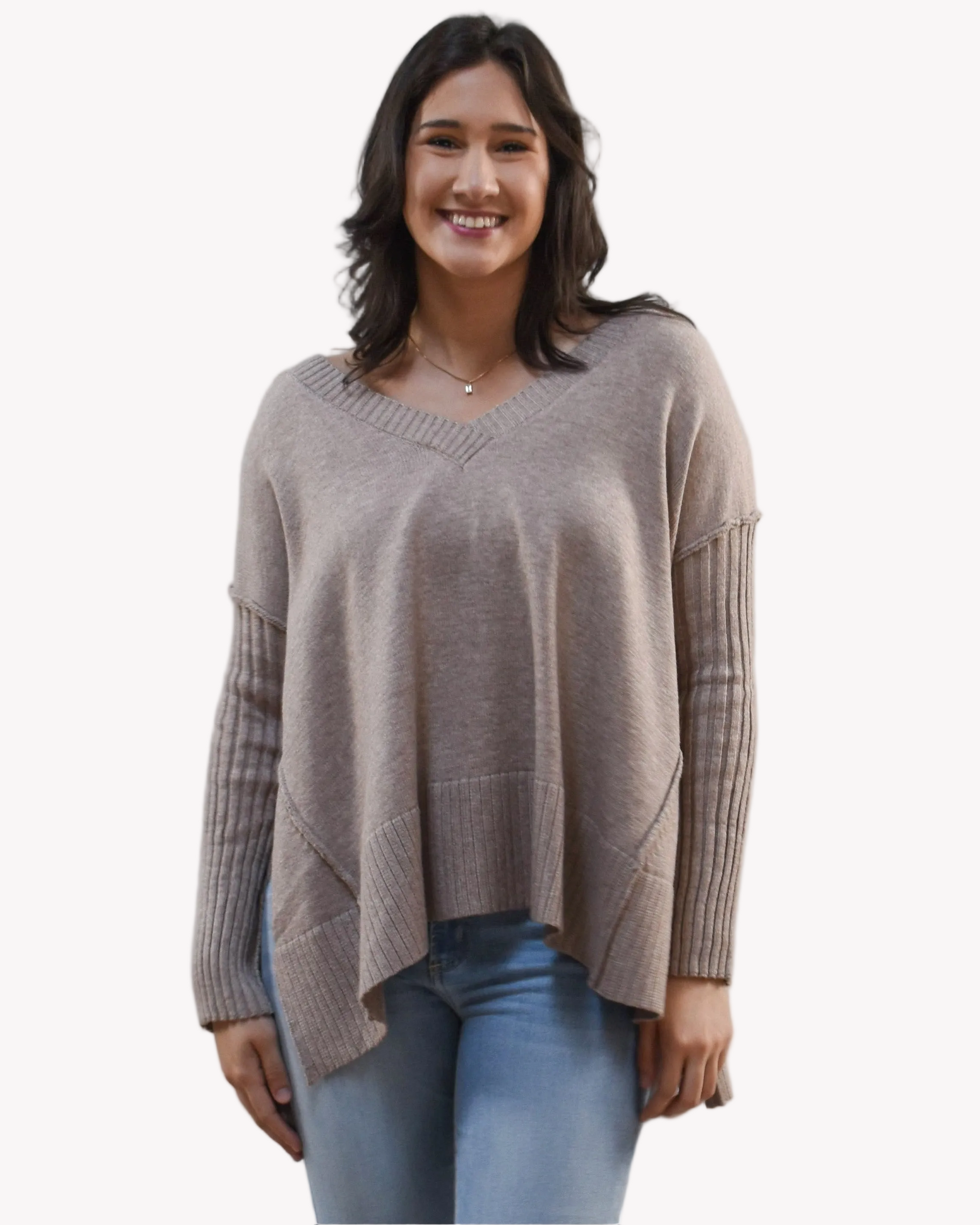 A timeless wardrobe staple with that effortless, polished ease. The Pure Ease Ribbed V-Neck Tunic features a clean V-neckline accented with ribbed piercing detail, a long relaxed silhouette, and subtle side slits that add movement without bulk. The viscose-nylon blend gives it a smooth, soft handfeel with beautiful drape—lightweight, breathable, and refined.